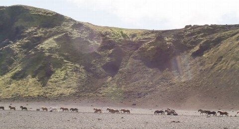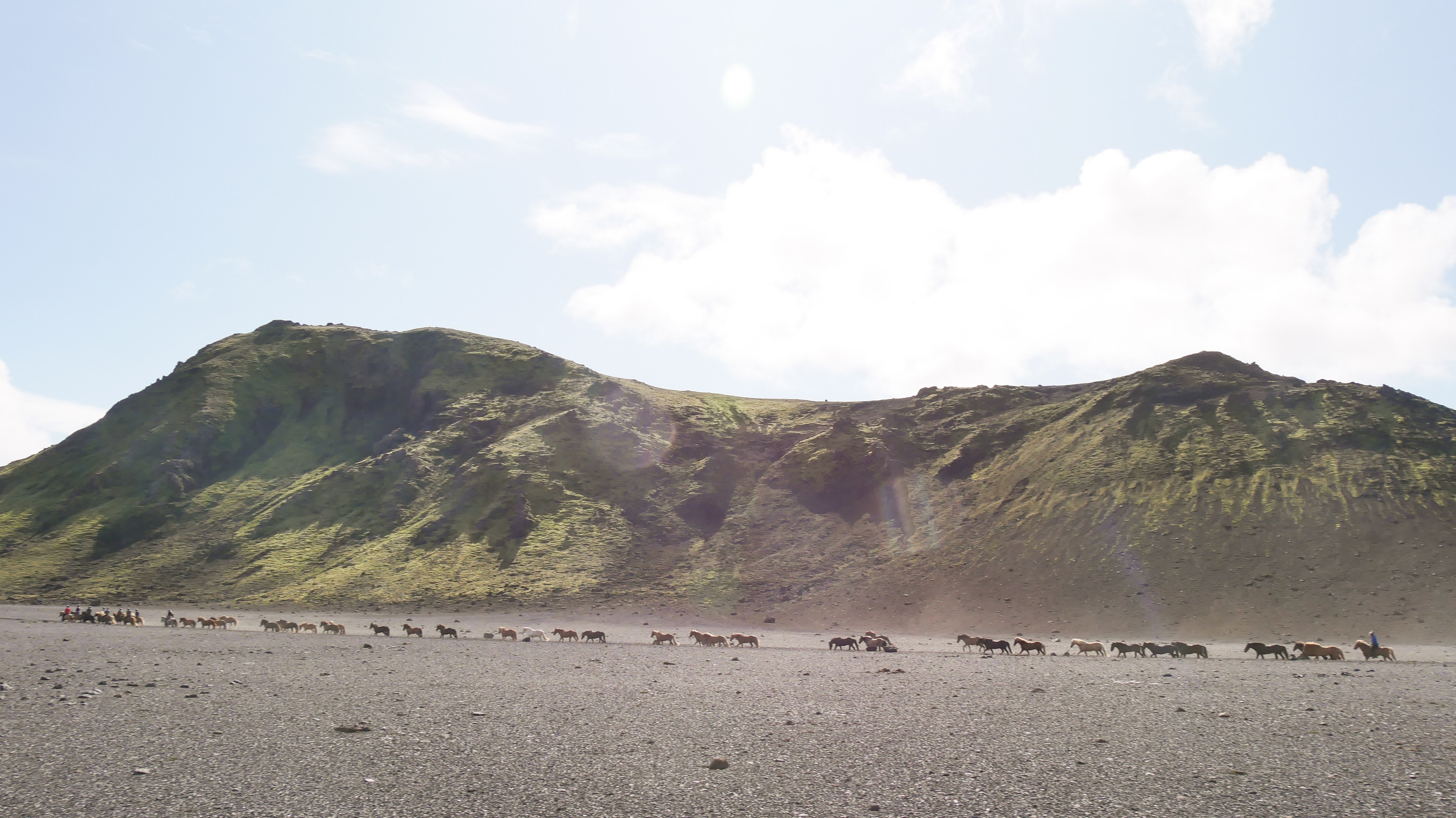 Der heutige Reittag wird sehr lang, aber hauptsächlich auf flachem Grund. Ca. 30 km reiten wir über die schwarze Sandwüste Mælifellsandur. Nachdem wir die Wüste durchquert haben, wird die Landschaft wieder etwas grüner und wir halten für die Mittagspause. Am Nachmittag reiten wir durch eine wunderschöne Schlucht bis wir die Berghütte erreichen, in der wir heute übernachten.