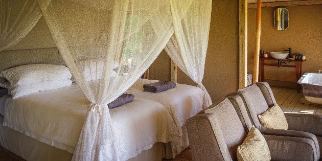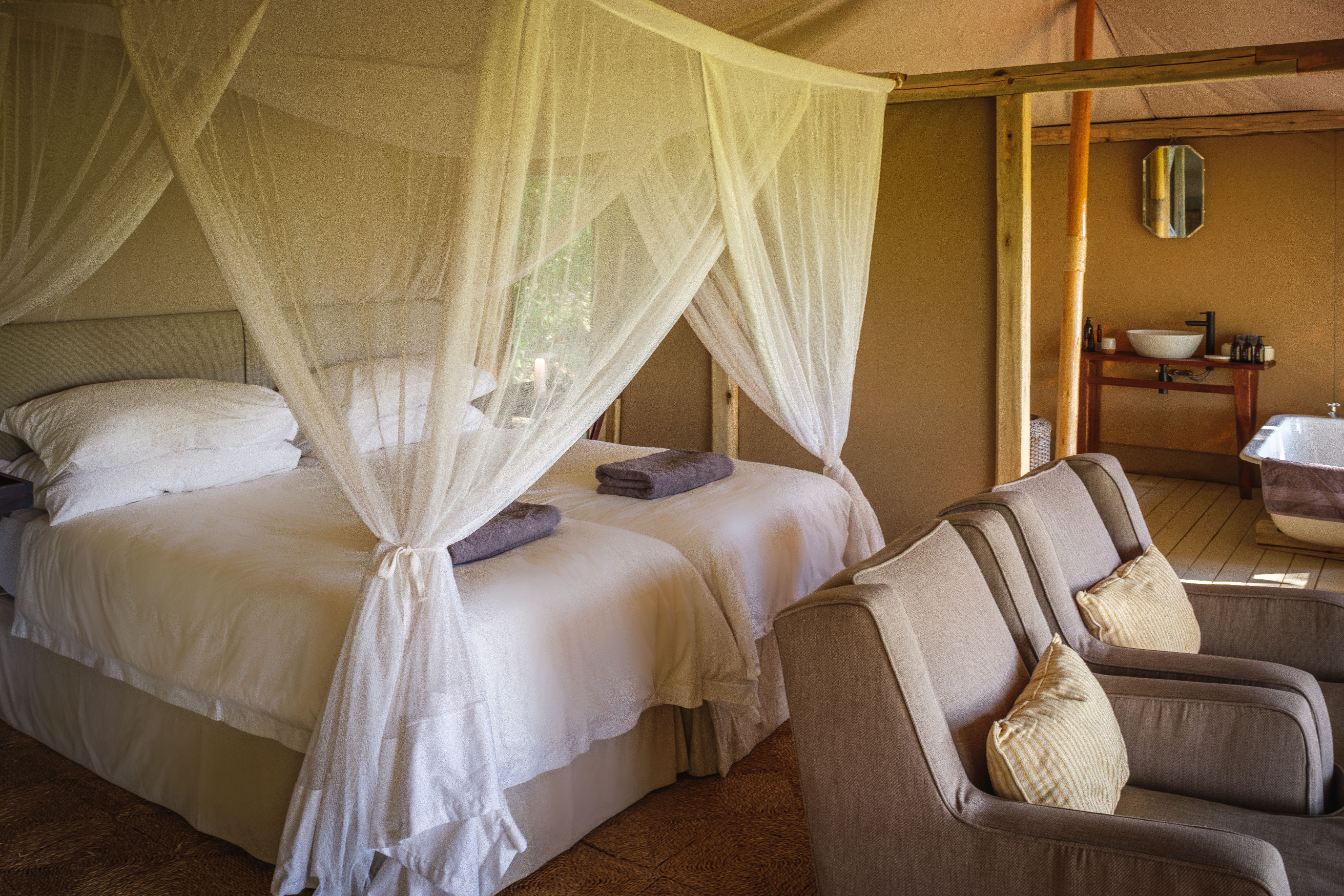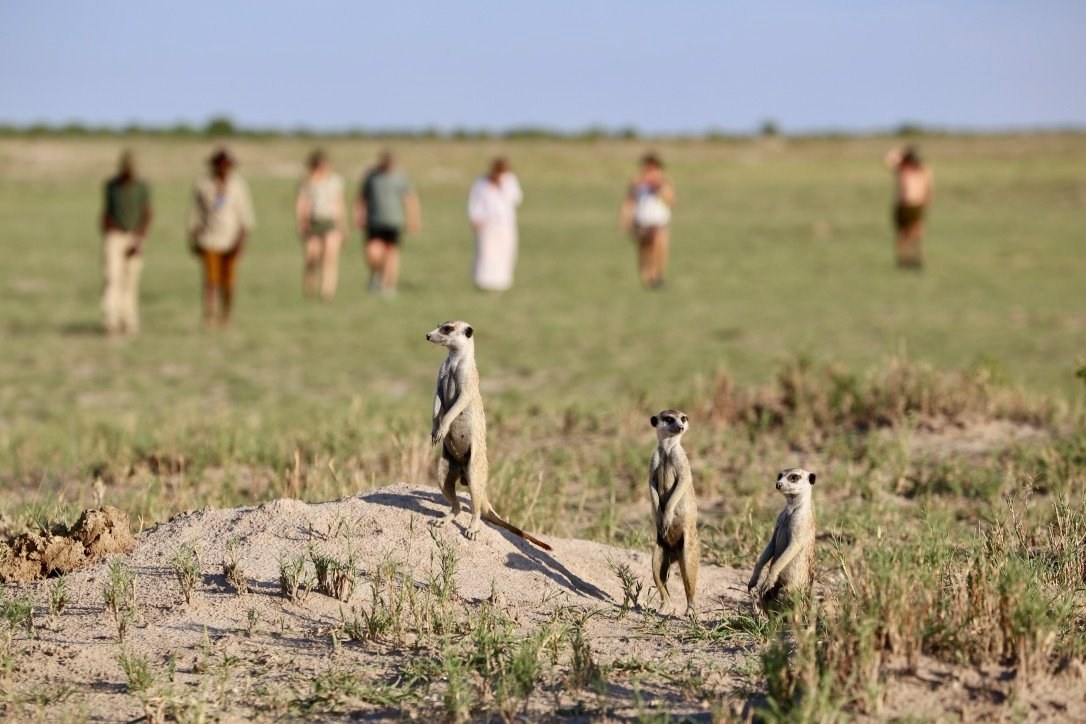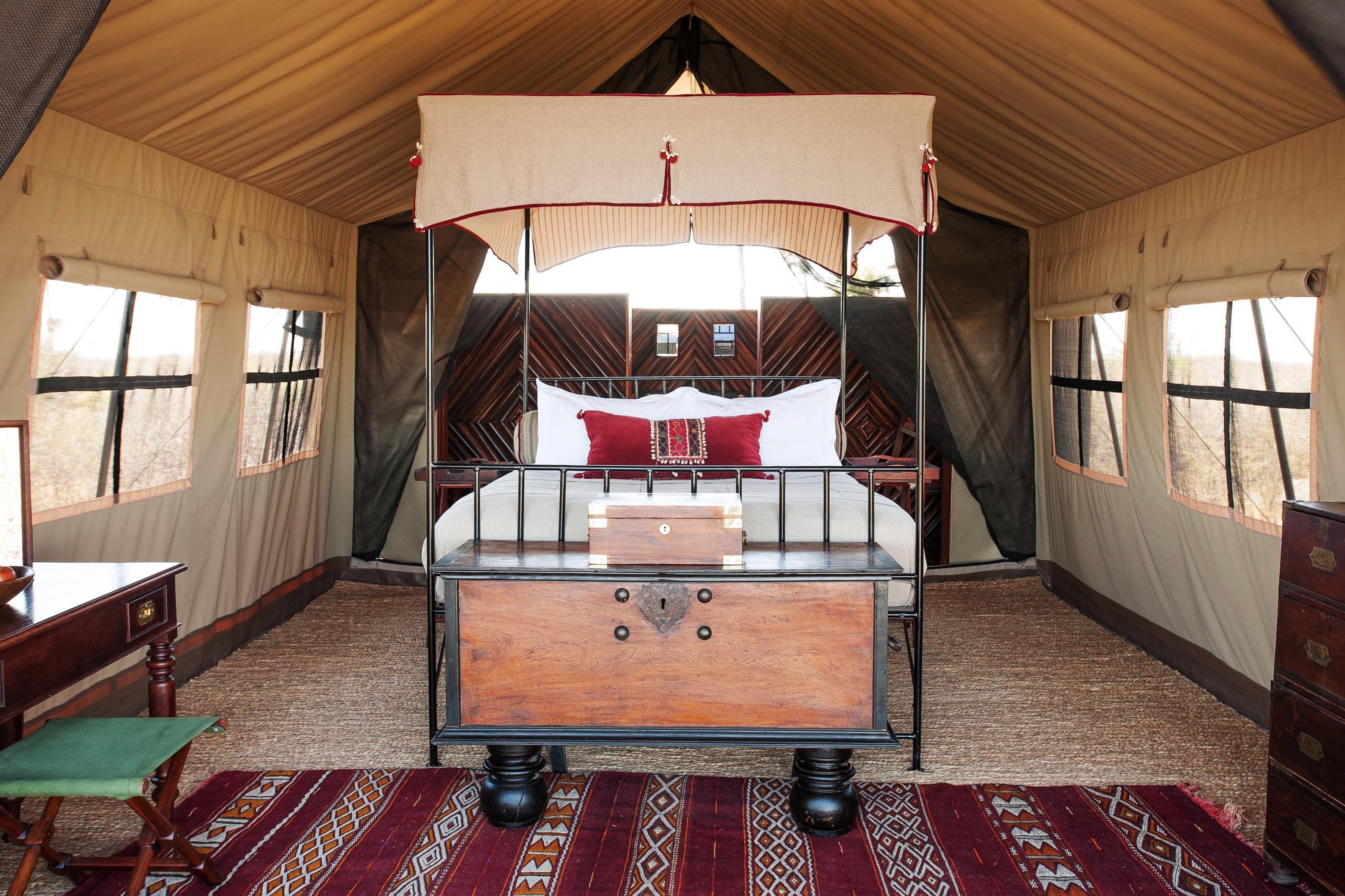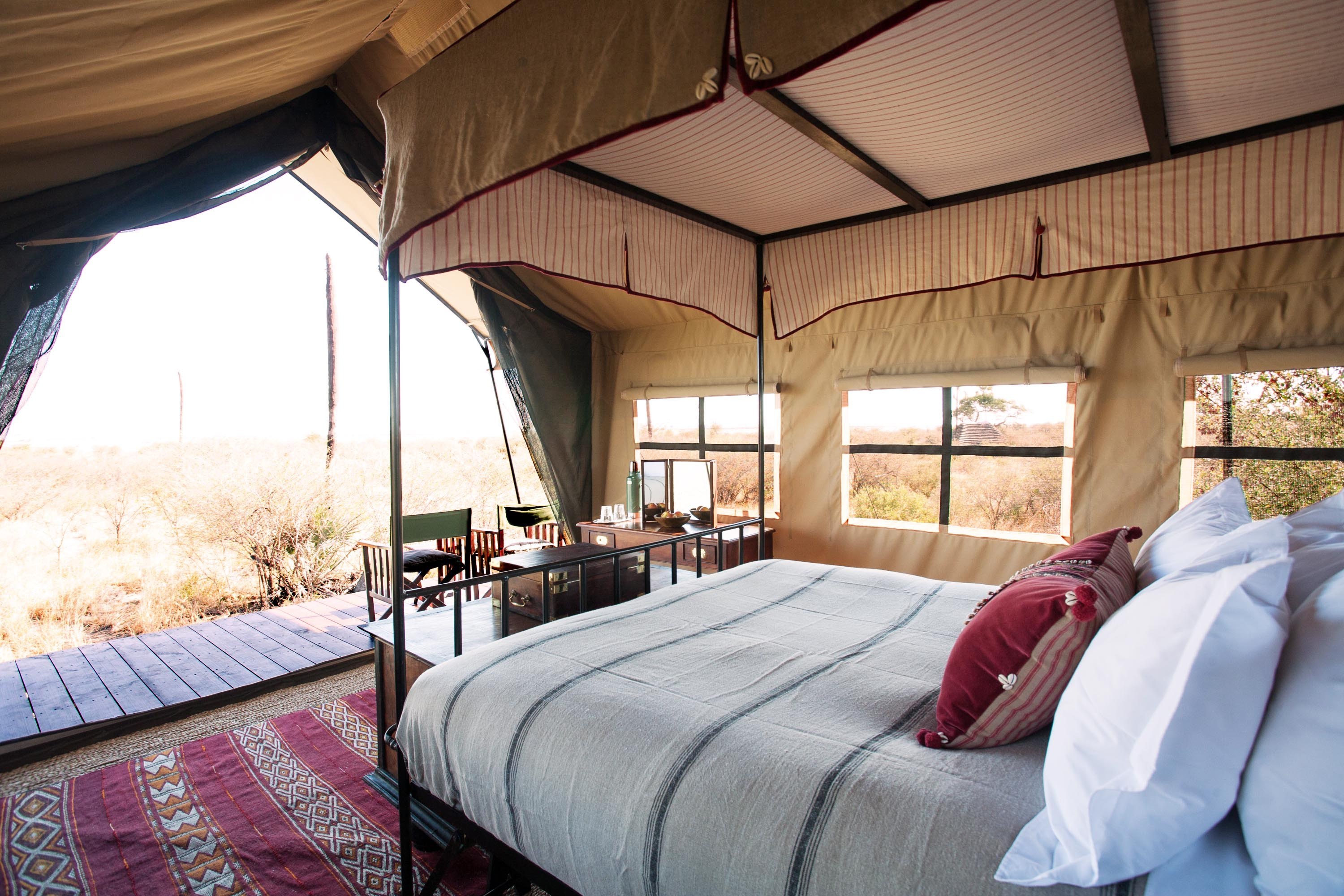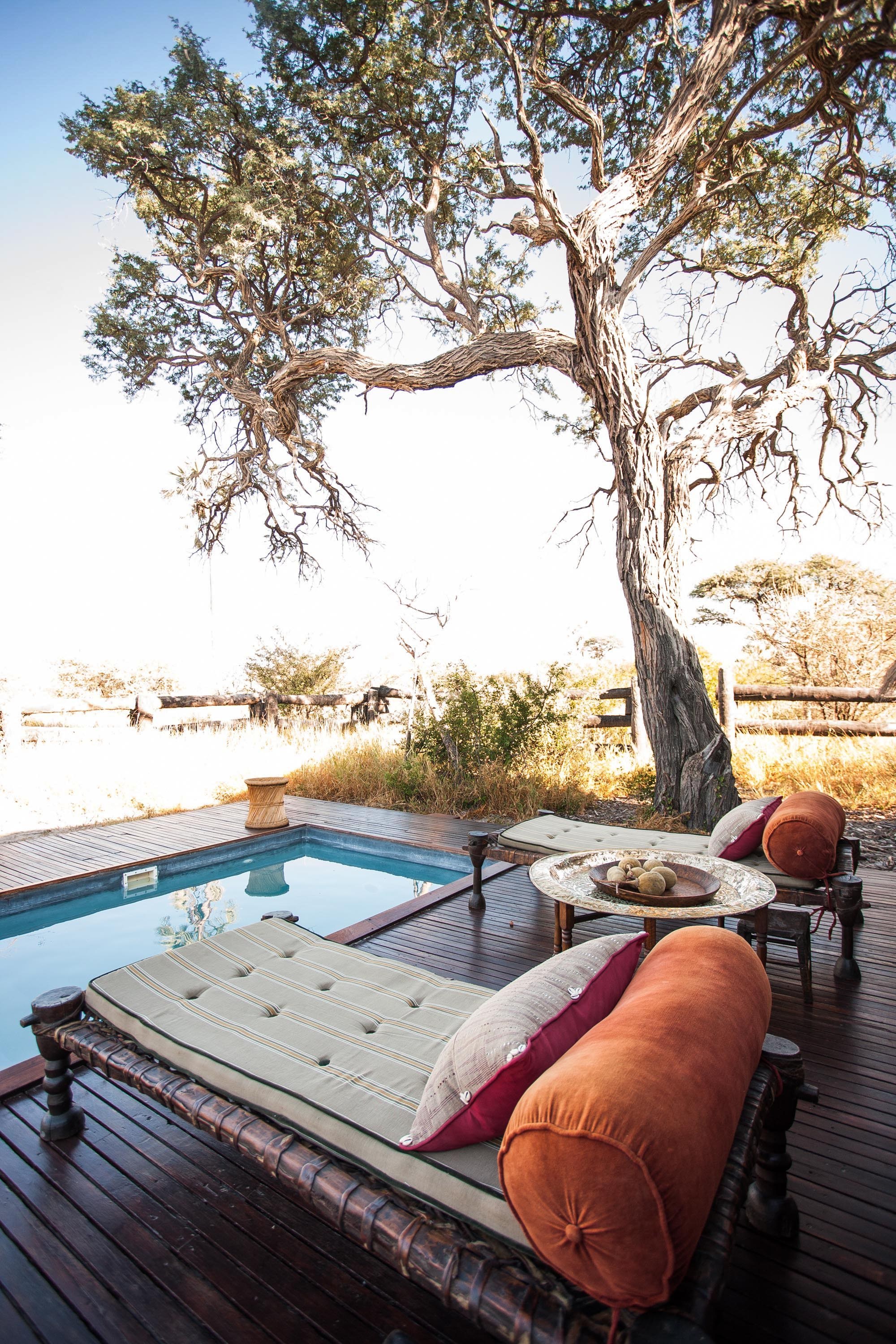 Ein kleines, intimes, persönliches Camp und ein grüner Fußabdruck, der die Verpflichtung beinhaltet, die Gemeinden vor Ort mit einzubeziehen. Mit einer Sammlung antiker Möbel der Familie dekoriert, fühlt es sich an, als würde man in seinem eigenen Zuhause herzlich willkommen geheißen. Cha Cha Metsi bietet Platz für nur 12 Gäste in zwei Familienzelten (2-4 Personen) und vier Meru-Zelten (1-2 Personen). Es überblickt das permanente Wasser der atemberaubenden Gama-Tau-Lagune – dem Sammelplatz der Löwen – und einen Teil des Santantadibe-Flusses. Die permanenten Gewässer sind einzigartig unter den Reitcamps des Deltas und ermöglichen das ganze Jahr Mokoro-Fahrten (traditionelles Einbaumkanu) und ganzjähriges Planschen durch die Gewässer zu Pferd. Die Mahlzeiten bestehen aus liebevoll zubereiteten lokalen Spezialitäten. Camp Kalahari Das Camp befindet sich eingebettet zwischen den Akazien und Mokolwane-Palmen der Insel Brown Hyaena, am Rande der Makgadikgadi-Salzpfannen, angrenzend an die Makgadikgadi-Salzpfannen des Nxai-Pans-Nationalparks. Eine strohgedeckte zentrale Bibliothek sowie ein Wohn- und Essbereich mit einer vielseitigen Mischung aus original afrikanischen Möbeln und Textilien, gepaart mit traditionellen Stücken im Kampagnenstil und Antiquitäten aus der Kolonialzeit, bieten den perfekten Bereich zum Entspannen und Genießen der Ruhe dieser bezaubernden Gegend. Erfrischen Sie sich im Swimmingpool oder genießen Sie eine Siesta im strohgedeckten Pavillon. Dieses traditionelle Buschcamp verfügt über zehn geräumige Meru-Zelte, darunter sechs Doppelzelte, drei Doppelzelte und eine Familieneinheit mit zwei angrenzenden Zelten, die jeweils zwei Gäste beherbergen und über ein miteinander verbundenes Badezimmer verfügen. Alle Gästezelte verfügen über ein eigenes, überdachtes Badezimmer, fließend heißes und kaltes Wasser und Spültoiletten sowie Himmelbetten, weiche Baumwollbettwäsche, hochwertige Textilien, marokkanische Kelims und Wärmflaschen im Winter.