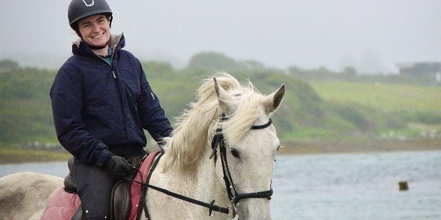 Reithelm, passendes Schuhwerk zum Reiten, wasserdichte Jacke und Hose, warme Pullover. Das irische Wetter ist nicht vorhersehbar.
