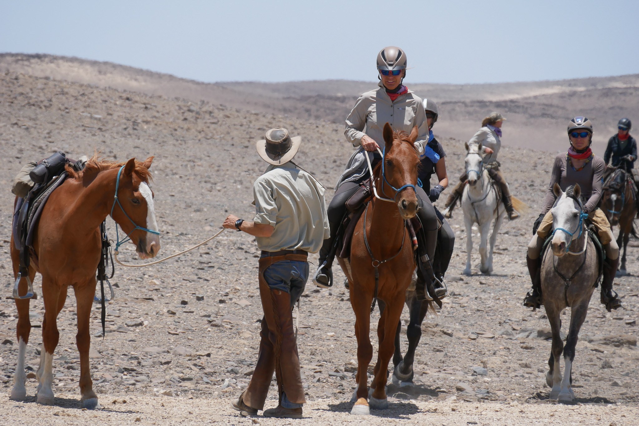 “Wir benutzen leichte Westernsättel und eine eigens für unsere Bedürfnisse angefertigte ‘vaquero’-Mischung zwischen ‘stock saddle’ und ‘western’. Wir haben eine eigene kleine Sattlerei, machen fast alles selbst und achten dabei ganz besonders auf das Wohl der Pferde und die Bequemlichkeit für den Reiter. Nach guten 40.000 km im Sattel wissen wir ganz genau, worauf es ankommt! Gezäumt wird mit Wassertrensen oder gebisslos. Satteltaschen sind vorhanden” - Team vom Wüstenritt