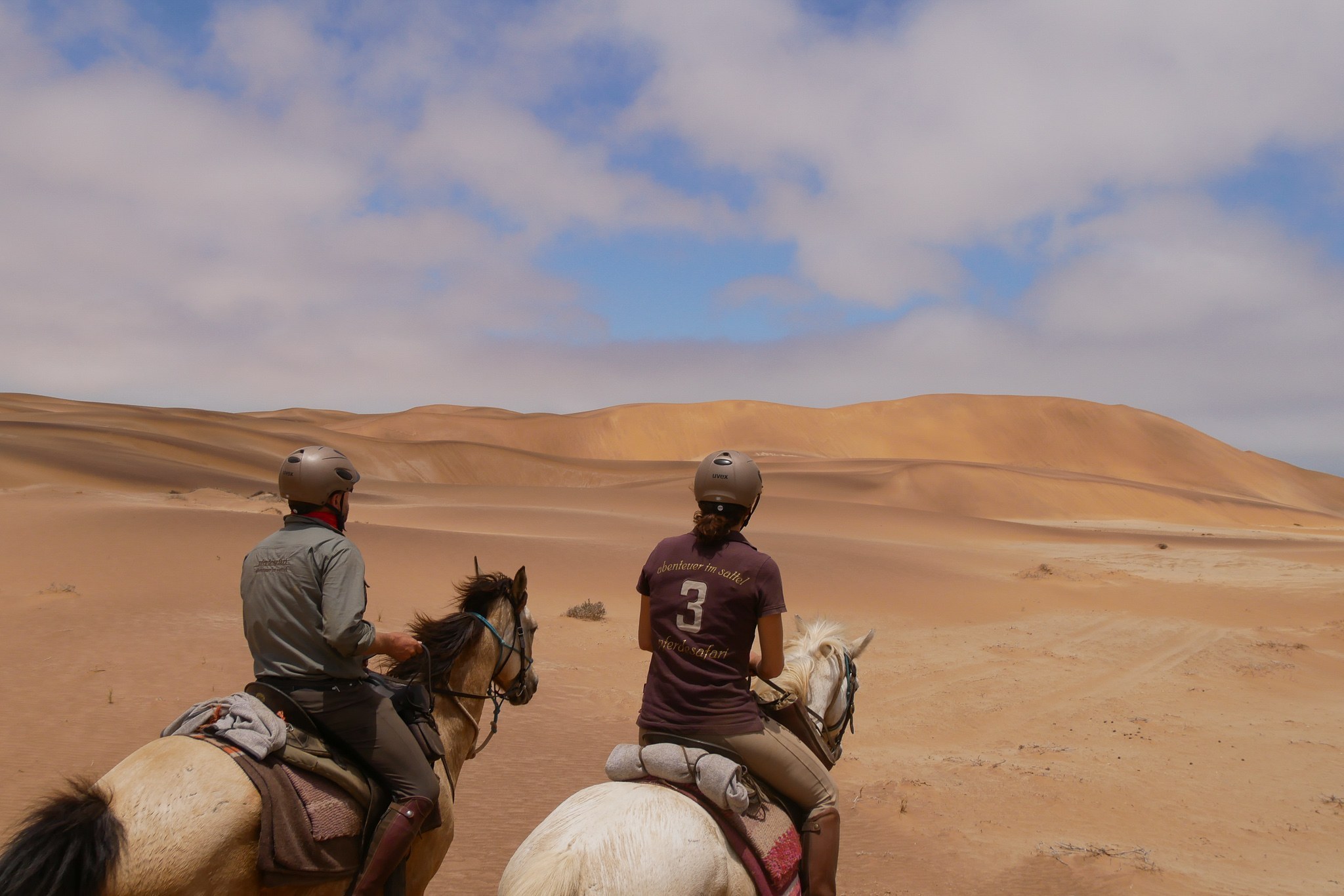 Gewicht Das Gewichtslimit liegt bei 85 kg in Reitkleidung. Reitern, die über 85 kg in Reitkleidung wiegen, wird gegen einen Aufschlag von 1.110,- Euro ein zweites Pferd zur Verfügung gestellt (laut Bestimmungen der World Horse Welfare (ILPH International League for Protection of Horses)). Reiterliche Anforderungen Da dieser Ritt einer der härtesten Ritte der Welt ist, müssen Sie körperlich gesund und reiterlich topfit sein! Sie sollten einen gesunden Sinn für Humor haben, nicht zimperlich sein und ausreichend Erfahrung im Umgang mit Pferden haben. Sechs bis acht Stunden im Sattel pro Tag, alle Gangarten, unterschiedliches Terrain. Sie brauchen kein passionierter Dressur- oder Springreiter sein, müssen aber auf jeden Fall sattelfest und geländesicher sein (als Probe versuchen Sie mal, an der Longe freihändig und ohne Bügel zu galoppieren). Reiter, die nicht über die erforderlichen Reitkenntnisse und die entsprechende körperliche Fitness verfügen, können von der Safari ausgeschlossen werden. Helmpflicht Wir empfehlen dringend das Tragen eines Reithelms. Reiten ohne Helm erfolgt auf eigenes Risiko. Sie müssen immer daran denken: Der Wüstenritt ist ein sehr schneller Ritt zum Teil über Stein und Geröll. Gelände/Landschaft/Tiere Sie erleben die älteste und eine der landschaftlich reizvollsten Wüsten der Erde, die Namib. Mit ihren ockerfarbenen Dünen, großen Ebenen und einzigartigen Wüsten beeindruckt diese auf den ersten Blick unwirtliche Gegend mit ihrer außerordentlichen Größe und ihren spektakulären Landschaften. Sie besuchen zuerst die berühmten Dünen der Sossusvlei.